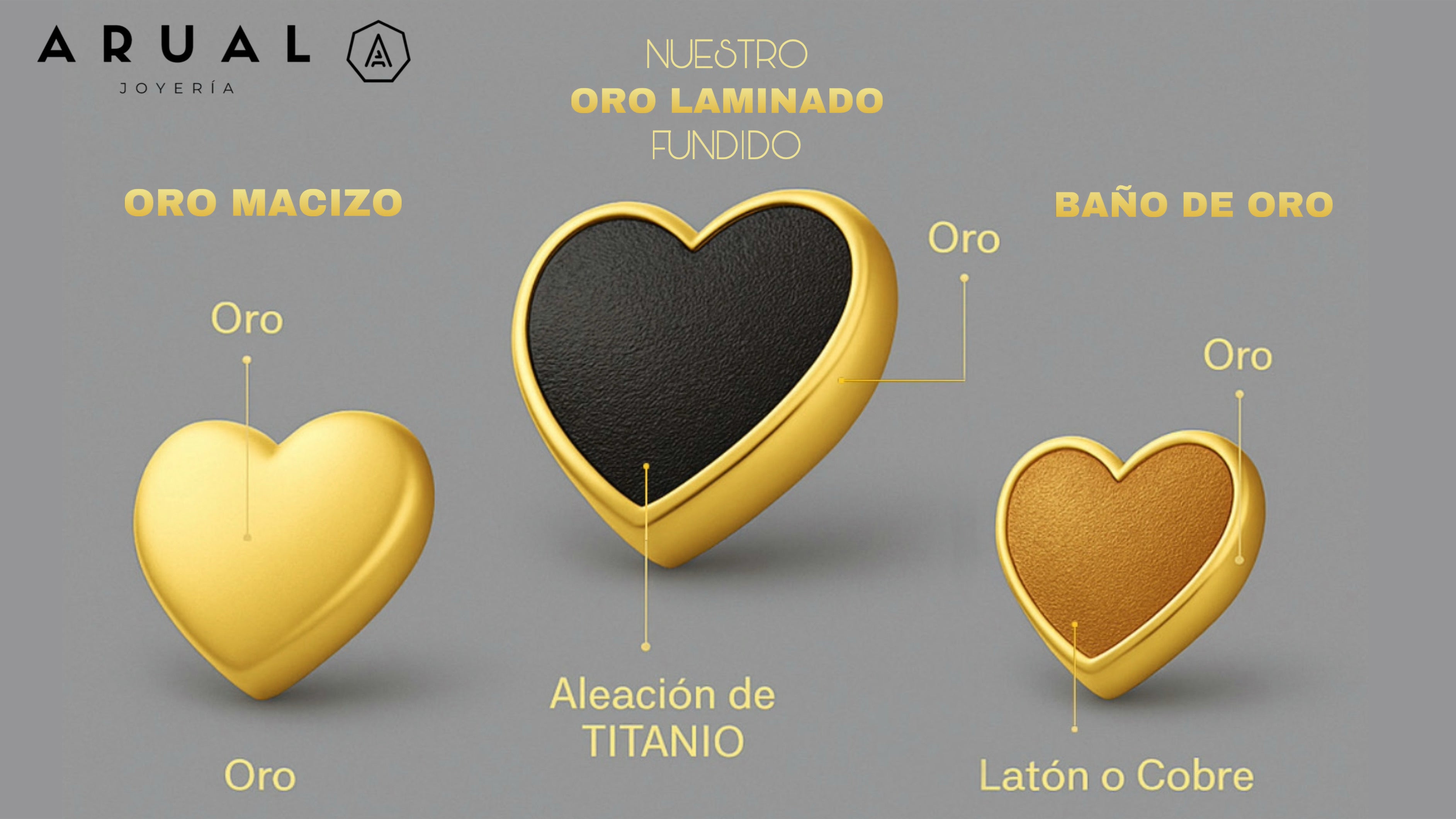 En nuestro oro laminado La capa del oro es mas gruesa que el baño además el titanio se usa en anillos, pulseras y collares debido a su resistencia, ligereza y hipoalergenicidad.