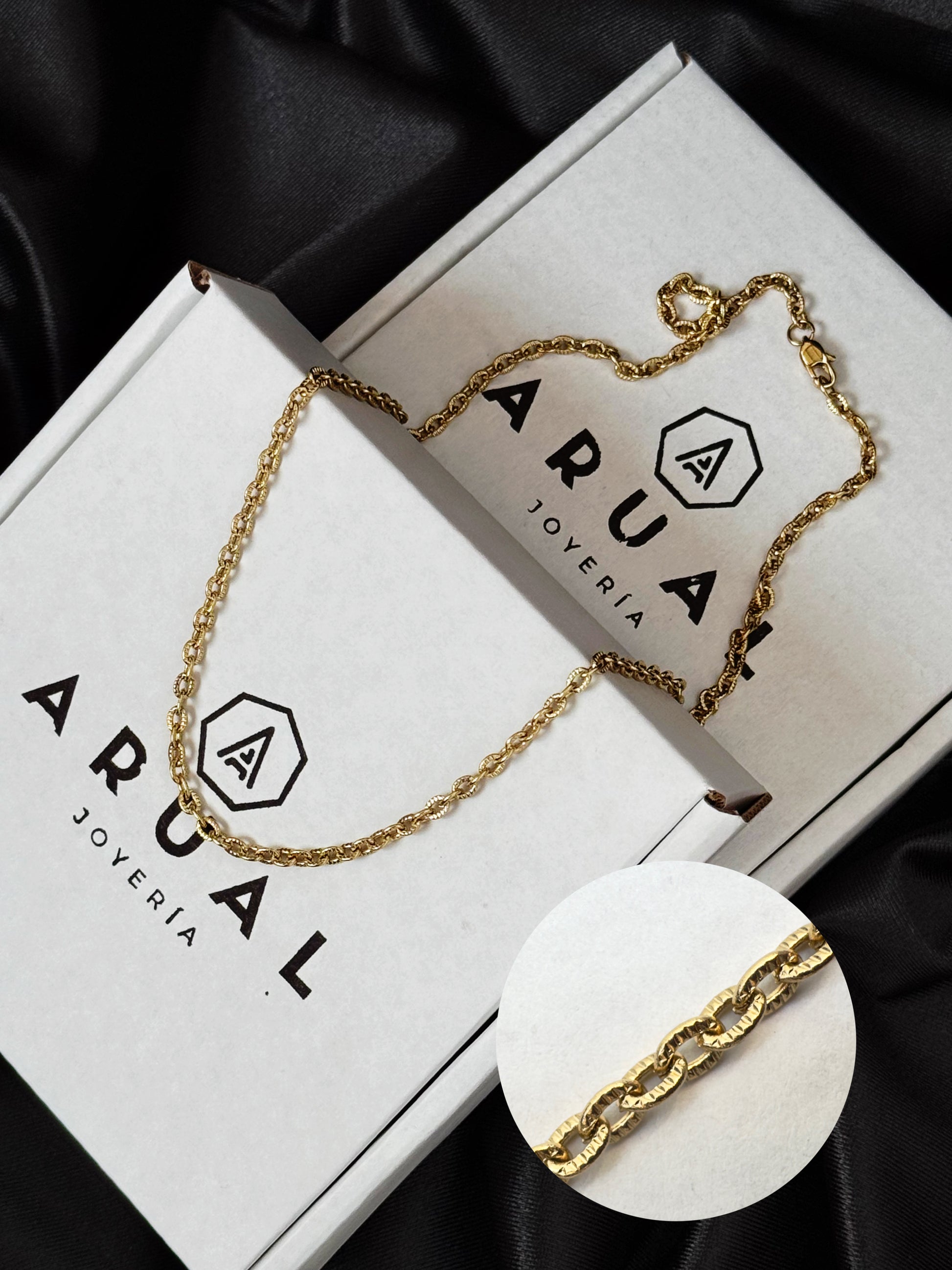 Es una fundición de Oro 18k sobre titanio, que crea una capa gruesa de Oro, con color, brillo y textura de este; lo que hace que sea una joya duradera y resistente. Por esta razón su garantía es de 1 año.